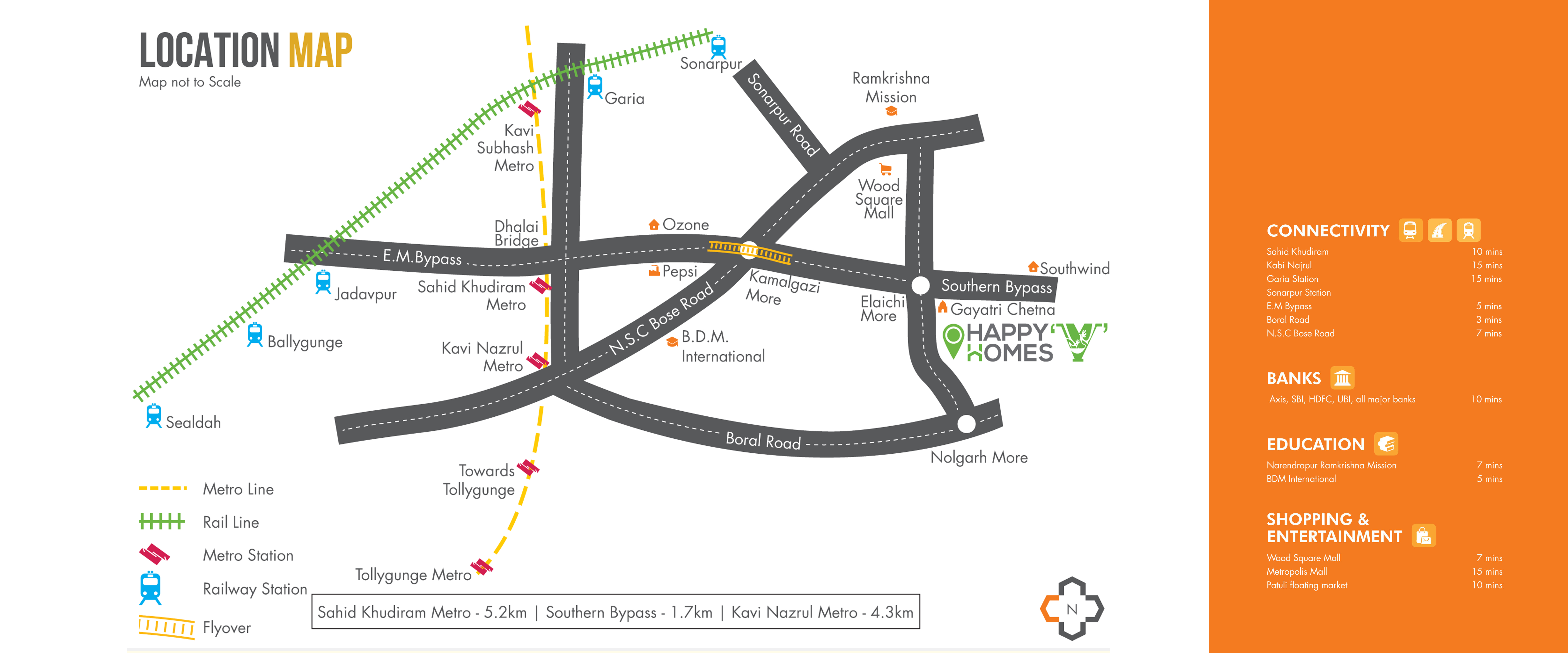 The project is the just 1.7 Km from estern metropoliton bypass and 2.8 Km from Kamalgazi - Bypass crossing. Also distance from site to Garia Metro station is just 4.5 Km away. Project is close to all its daily necessities that ensure a complete and simple city life